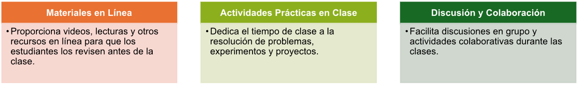 Los estudiantes adquieren la información teórica en casa (aprendizaje autónomo) y utilizan el tiempo de clase en la universidad para las actividades prácticas (aprendizaje colaborativo), resolución de problemas y discusiones.