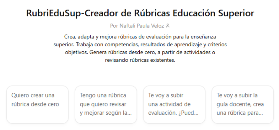 Se puede acceder al asistente de manera gratuita, pinchando en: https://chatgpt.com/g/g-67f6ae5a193c81919308efaeecc80786-rubriedusup-creador-de-rubricas-educacion-superior