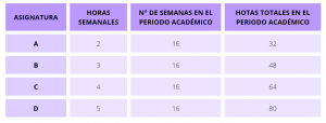 Usualmente la experiencia de la programación y diseño de las asignatura, ha seguido la lógica de la distribución espaciada de las mismas en un período académico de 16 semanas, así tenemos que una asignatura se desarrolla, por ejemplo, en 4 horas semanales, totalizando 64 horas en todo el período, de esa misma manera se distribuyen las diversas asignaturas según el número de horas establecidas en los planes de estudio, en forma gráfica sería: