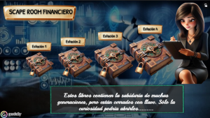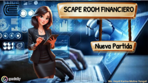 La portada del escape room presenta un diseño interactivo en la plataforma Genially, con gráficos llamativos que introducen la narrativa del juego. Incluye instrucciones claras y atractivas para captar la atención de los participantes, así como una introducción a la temática financiera del desafío.