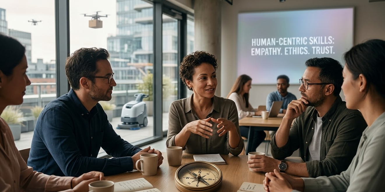 - Resolución de Conflictos: Las máquinas son lógicas; los humanos somos emocionales. Los conflictos en el trabajo suelen ser emocionales, y se necesita una «Power Skill» humana para desactivarlos.