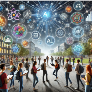 DALL·E 2024- A visual representation of personalized university learning paths empowered by AI. The image shows a diverse group of university students interacting [Imagen generada por IA].