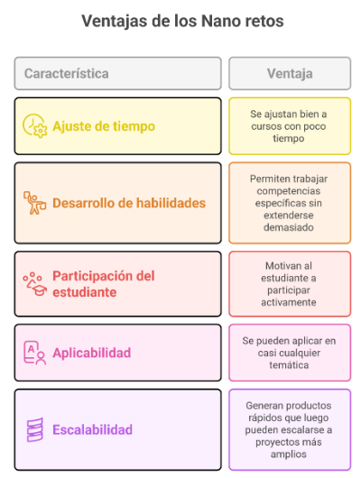 ¿La razón? Al condensar objetivos y demandar respuestas creativas contra el reloj, se favorece la autonomía y la participación activa. Esta perspectiva converge con la lógica del Nano Reto: experiencias cortas, bien estructuradas y orientadas a la acción que generan avances significativos en competencias clave, sin perder tiempo.