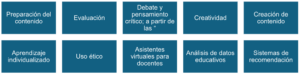 En tanto Blázquez (2024), en su artículo el uso docente de la inteligencia artificial en la educación universitaria, refiere los siguientes usos que los docentes pueden darle a la IAG: