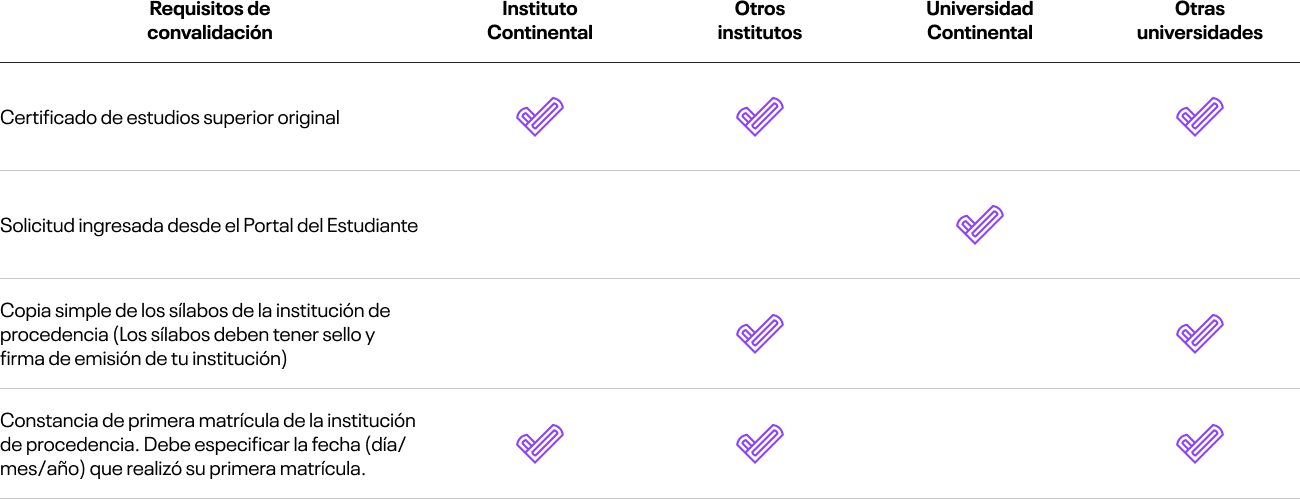 Debes haber completado al menos un periodo académico en la institución de donde provienes. Antes de iniciar en la Universidad Continental, asegúrate de recibir orientación de un Asesor Comercial, ya que es importante aclarar tu interés en realizar una convalidación.